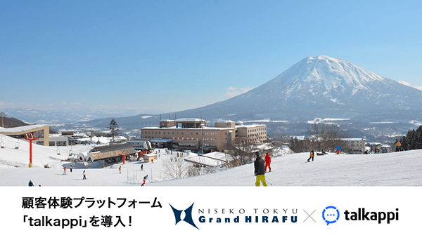 「顧客対応の効率化、自社販売率の向上を支援する」AI活用の顧客体験プラットフォーム「talkappi(トーカッピ)」を、東急リゾーツ&ステイ株式会社が運営するスキー場ニセコ東急 グラン・ヒラフ、およびオフィシャルホテルの、ホテルニセコアルペン、綾ニセコ他合計5施設へ導入いたしました。