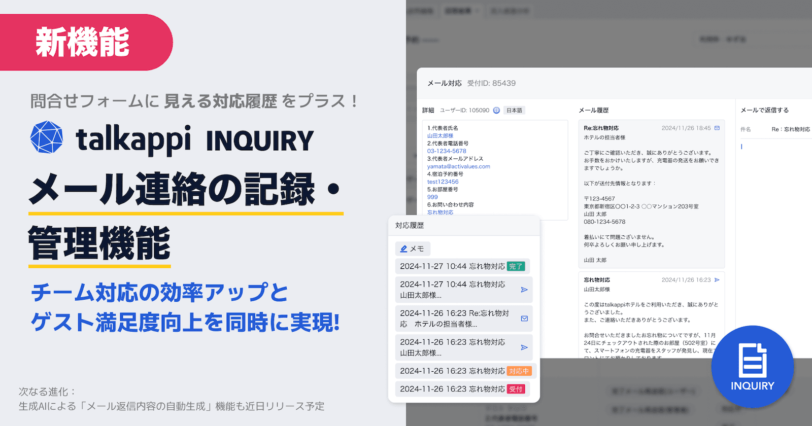 All in One Hospitality Cloud「talkappi」を提供する株式会社アクティバリューズ(本社:東京都渋谷区)は、宿泊施設向けの問合せ・受付フォーム「talkappi INQUIRY(トーカッピ インクワイアリー)」において、メールのやり取り履歴を自動で記録・管理できる新機能「メール連絡の記録・管理機能」を開発。一部施設での先行運用を経て、2025年7月25日より本格提供を開始いたします。