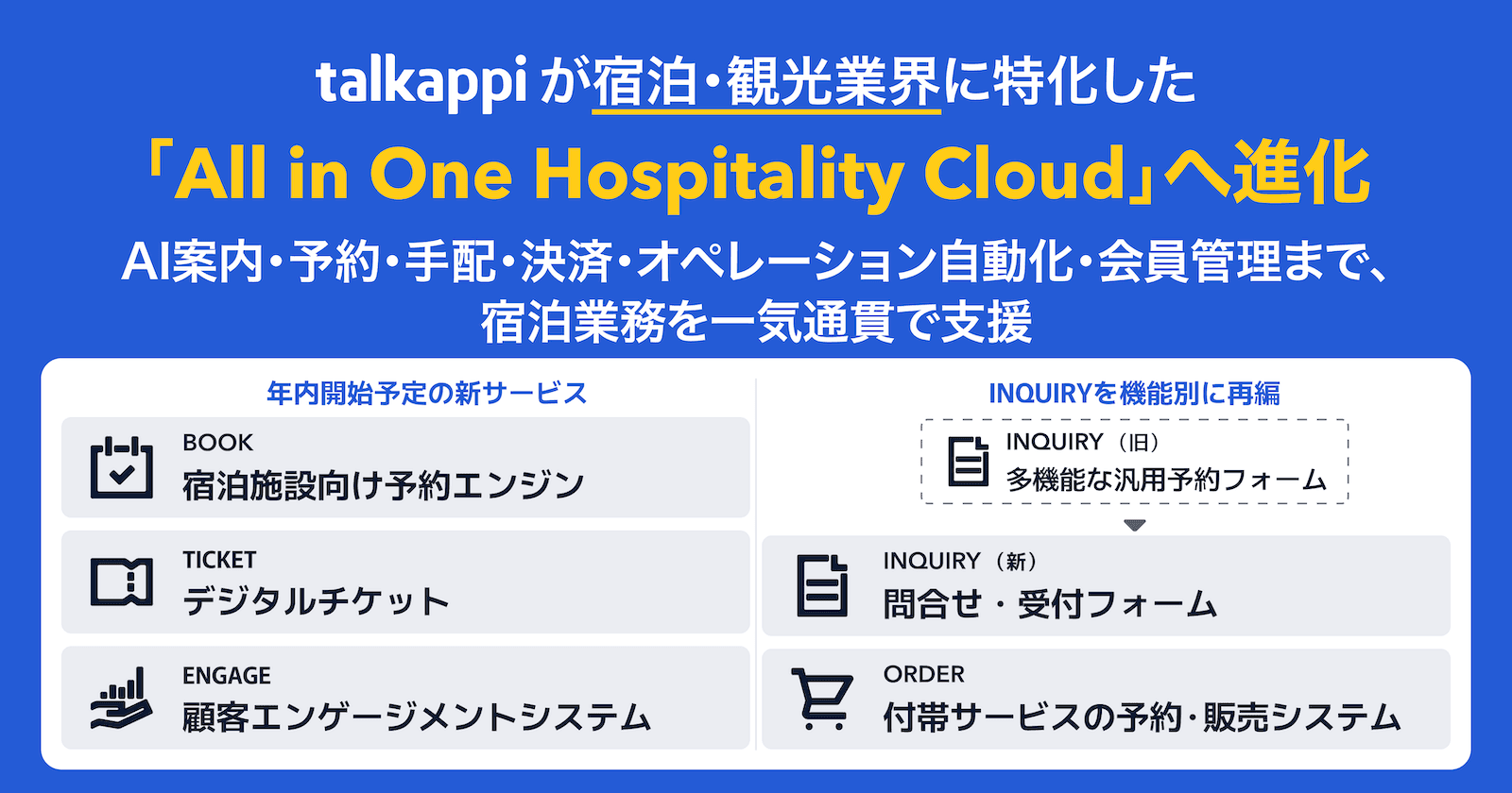 当社は、2025年7月15日、宿泊・観光業界向けに展開している「talkappi(トーカッピ)」の構成サービスを再編し、「All in One Hospitality Cloud」として新たな展開を開始いたしました。