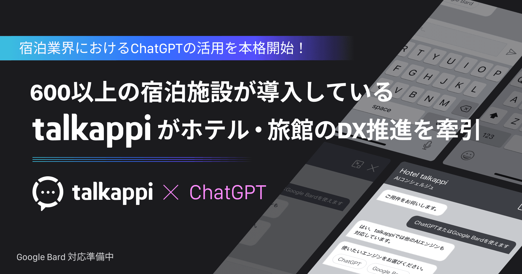 当社は2023年の年初からChatGPTだけでなく、Google Bardを含むさまざまな生成系AIとの連携を積極的に研究開発してきました。現在の生成系AIはまだ成長途中であり、多くの課題が存在しますが、ChatGPTとの連携を本格的に開始できたことを大変嬉しく思います。現在、ChatGPTの連携を開始した施設様と協力しながら改善を進めており、同時にGoogle Bardの適用の検証も加速しています。どうぞ、talkappiの進化にご期待ください。