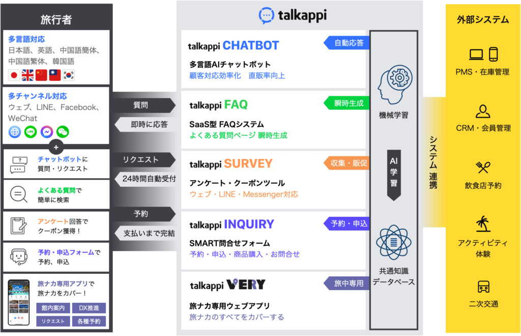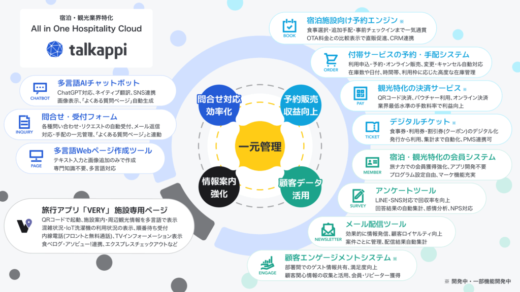 「VERY」では、旅行者が旅をもっと楽しめるよう、ホテル・旅館の施設案内、周辺の観光スポット・体験・アクティビティ・グルメ情報、イベント・チケット・交通手段など、多言語対応で幅広く情報を提供します。